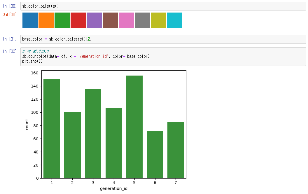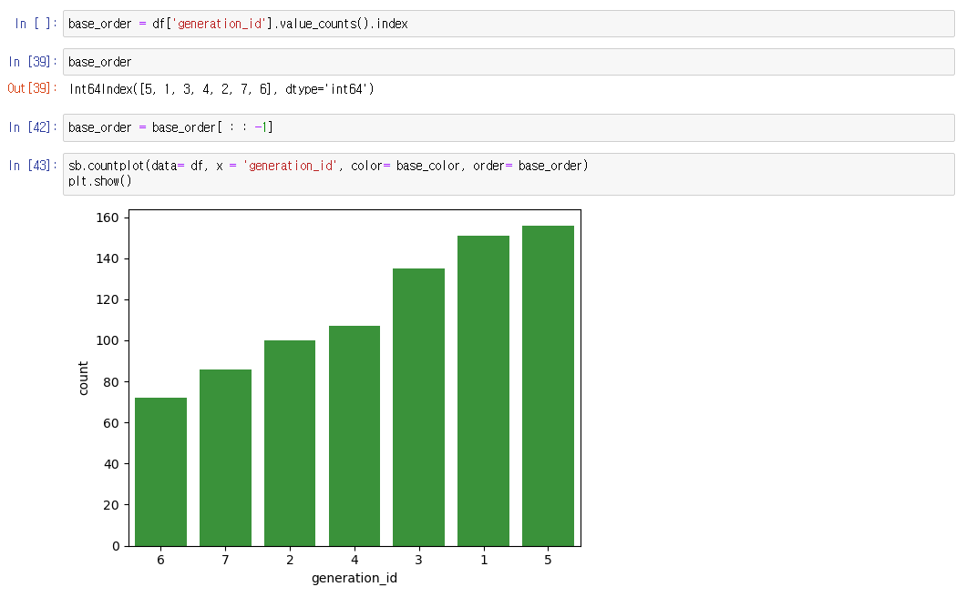 >>> sb.countplot(data= df, x = '컬럼', color= , order= )