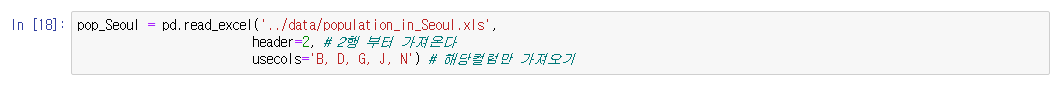 >>> pd.read_excel('xls파일', header= a, usecols= 'B, D, G, J, N')