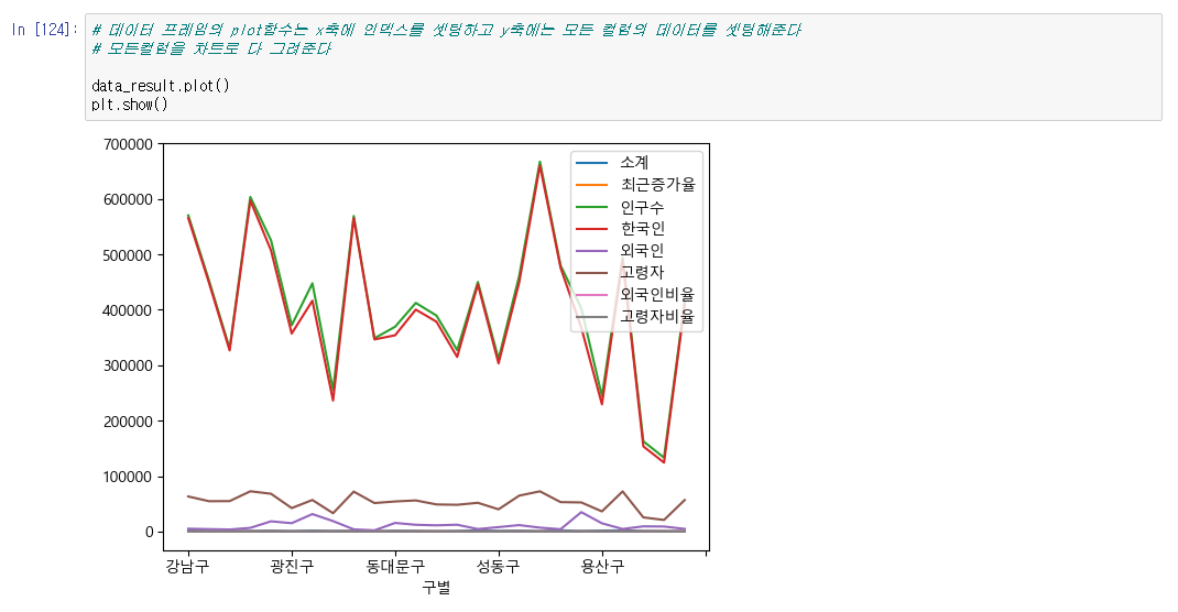 df. plot() : x축에 인덱스를 셋팅하고 y축에는 모든 컬럼의 데이터를 셋팅한 차트를 만들어준다