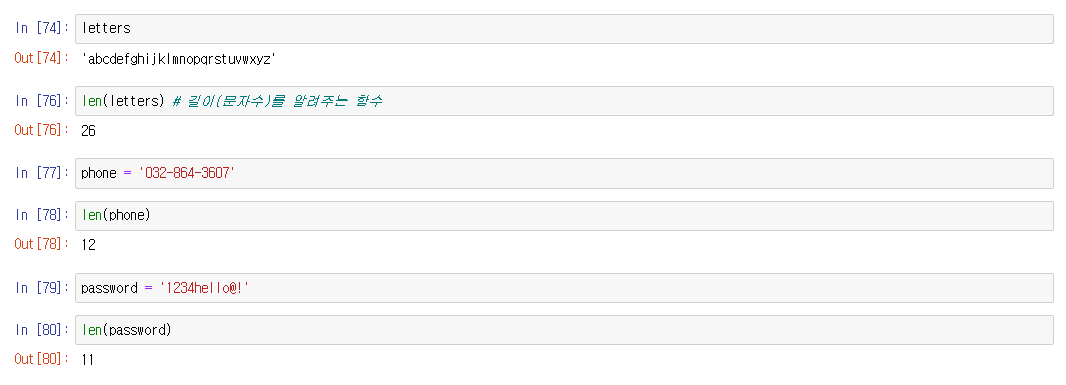 len() 함수를 사용하여 몇개의 문자로 되어있는지 해당 문자열의 개수를 알 수 있다