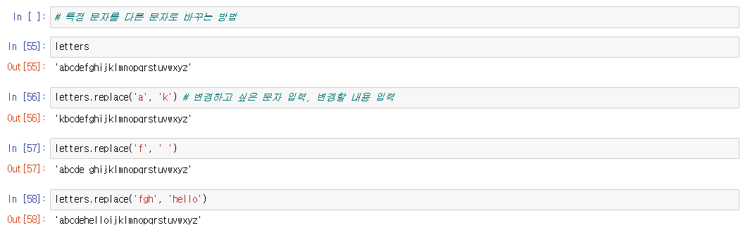 혹은 문자열을 바꿀 수도 있다. ' fgh ' 를 ' hello '로 바꾼다