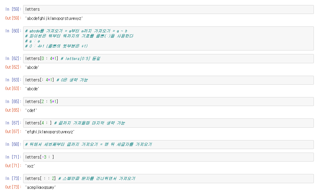 문자열에서 원하는 부분을 슬라이싱 하기 위해서는 인덱스의 숫자를 적어준다