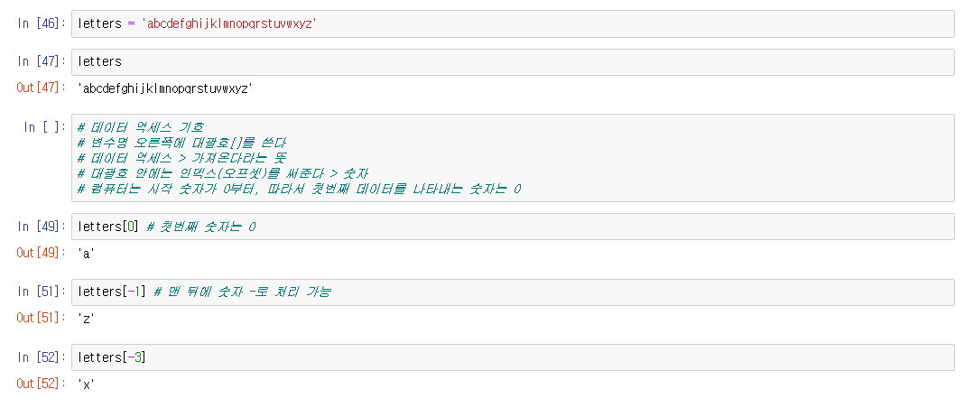 하나의 문자만 추출하려면 추출하려는 문자의 인덱스 숫자를 써준다 (인덱스는 항상 0 부터 시작한다)