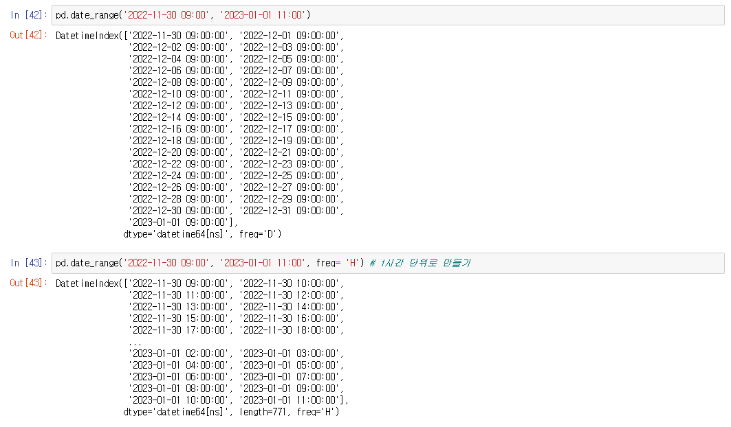 >>> pd.date_range('2022-11-30 09:00', '2023-01-01 11:00', freq= 'H') # 1시간 단위로 생성