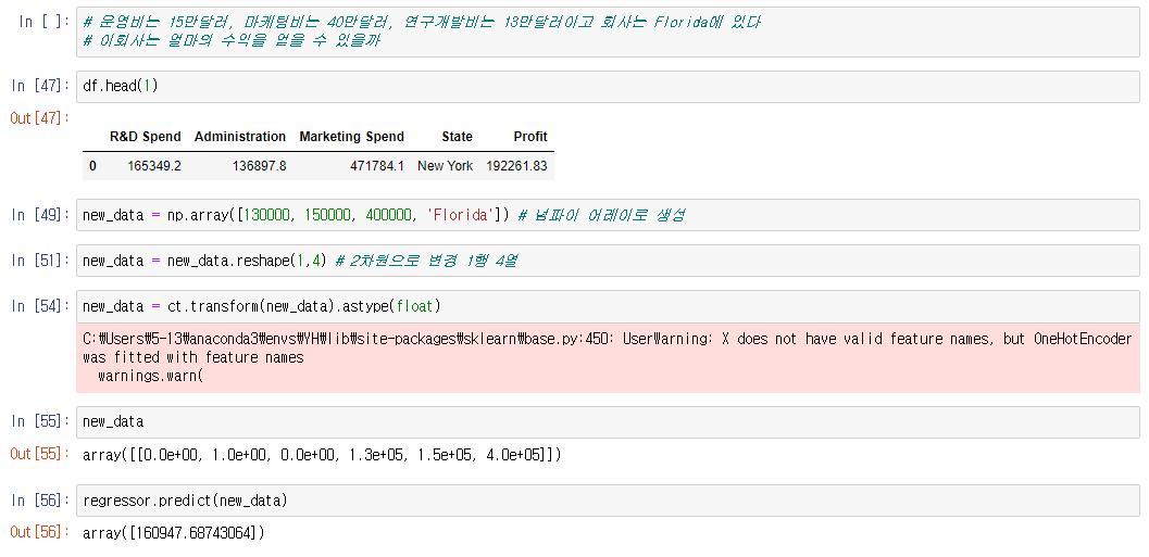 >>> new_data = np.array([130000, 150000, 400000, 'Florida'])
