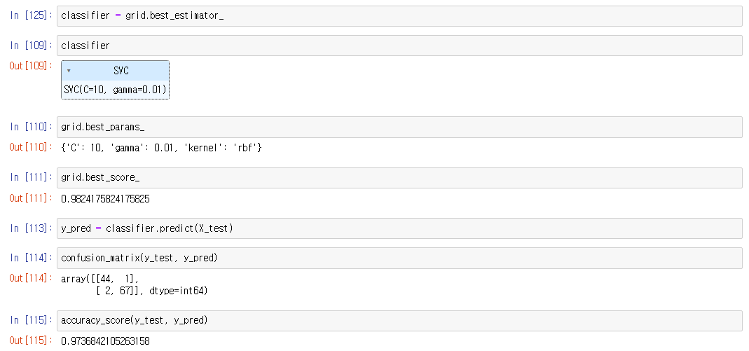 param_grid = { 'kernel' : ['liner', 'rbf', 'ploy'], 'C' : [0.1, 1, 10], 'gamma' : [0.01, 0.1, 1] }