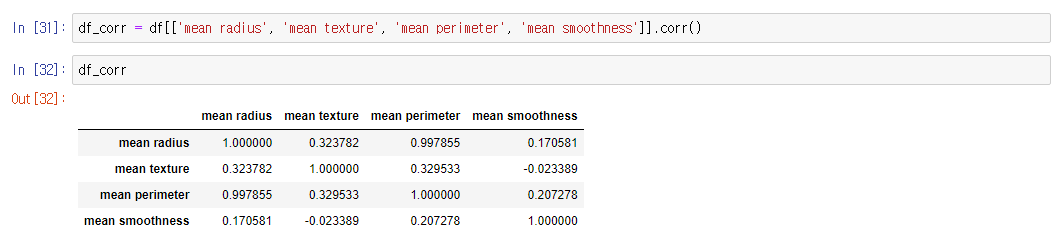 df_corr = df[['컬럼1', '컬럼2', '컬럼3', '컬럼4']].corr()