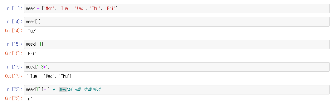 리스트 맨 끝의 값은 -1 이다. Fri는 -1 , Thu 는 -2, Wed 는 -3 이렇게 접근할 수 있다