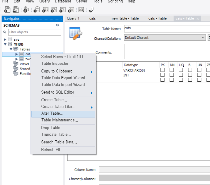 테이블을 수정하려고 할때 수정할 해당 테이블을 우측 클릭하고 Alter Table을 누르거나