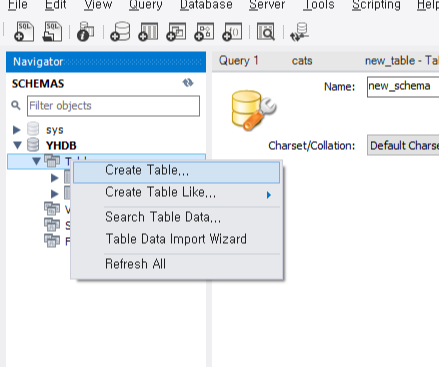 테이블 만들기는 해당 서버를 클릭하면 아래에 나오는 Tables의 마우스 우측 클릭해서 Create Table 클릭해서 만들거나