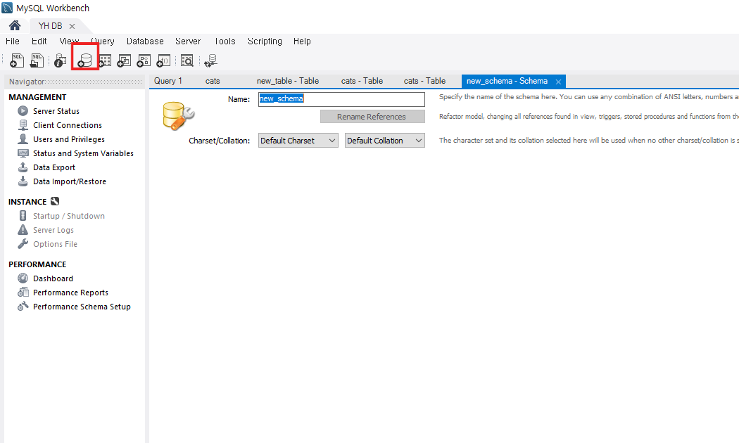 서버만들때 사용했던 원통모양 아이콘 옆에 있는 아이콘을 클릭한다