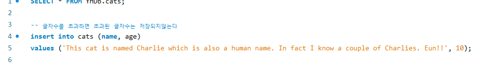 테이블을 생성할때 Varchar() 값을 50으로 줬다면 50을 초과하는 글자수는 저장되지않으므로 주의
